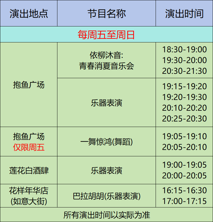 每日两场:19:30 / 20:30(每场15分钟,前5分钟播放提示音乐)